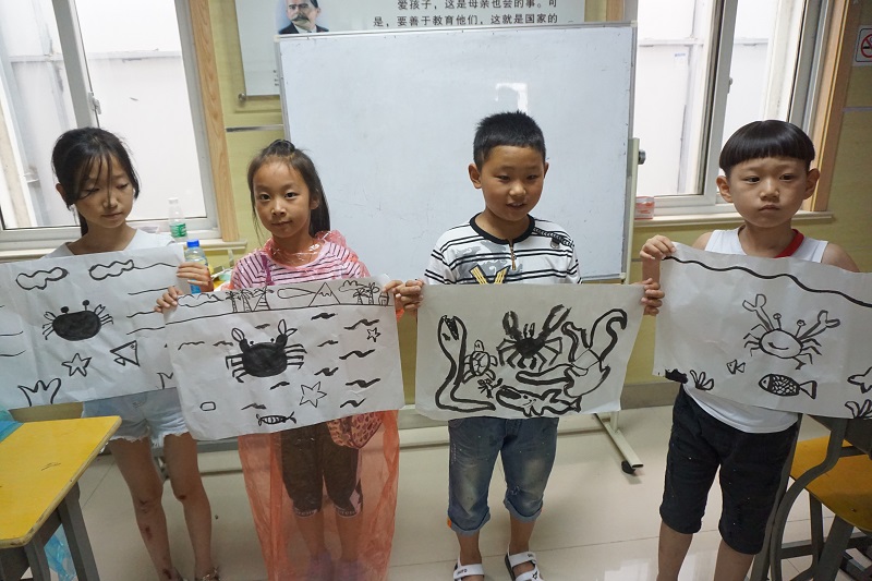 最后,同学们继续之前的毛笔练习,开启了国画之旅。不比毛笔字的一笔一画的临摹,讲究形似,国画则更偏重于神似。同学们学习和创新了教学视频中的螃蟹,画出了自己笔下最生动的螃蟹,一拖一拉的渲染,手法虽是生疏但却力求完美,新旧的结合在墨水点纸的瞬间晕染开来。
