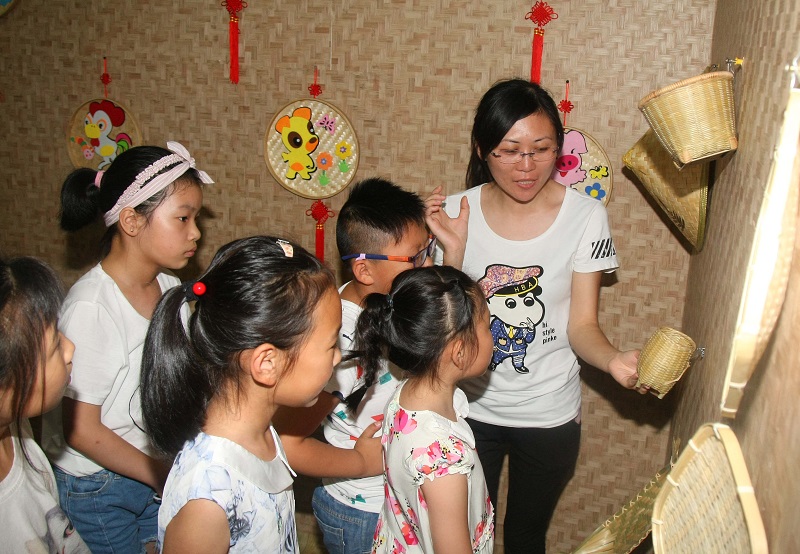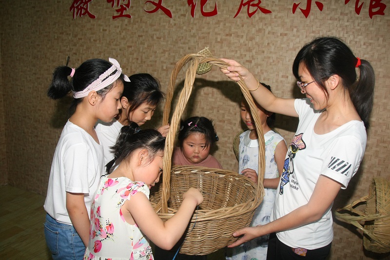 竹编艺术是传统的民间手工艺术。它以竹子为原料,精制成各种类型的工艺品,其独特的构思、精美的造型、精湛的工艺,堪称一绝。为挖掘竹编历史内涵,传承竹编文化精神,育爱村联合老手艺人蔡振华在村部建设竹编微型文化展示馆。该馆主要展示了一些农家用品,有竹篮、鱼篓、筛子、果盘之类的农用和家用器具。7月10日,陈桥街道育爱村竹编微型文化展示馆对外开馆,并组织儿童前来参观,在竹编艺人的指导下儿童们学做竹蒸片等竹蔑制品。