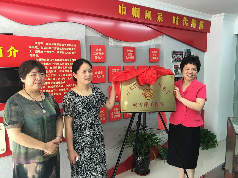 钮主席一行首先来到唐闸镇街道怡园新村的 “红浪驿家” 服务站,了解区首家姐妹微家建设情况,随后又来到南通泽旺保洁公司为区首个“省三八红旗手”工作室——成雪萍工作室揭牌。